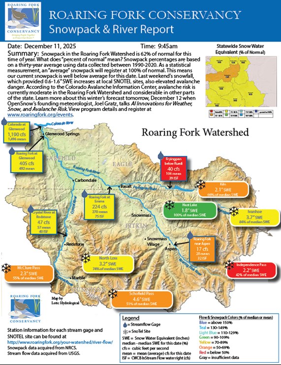 Snowpack in the Roaring Fork Watershed is 62% of normal for this time of year. What does “percent of normal” mean? Snowpack percentages are based on a thirty-year average using data collected between 1990-2020. As a statistical measurement, an “average” snowpack will register at 100% of normal. This means our current snowpack is well below average for this date. Last weekend’s snowfall, which provided 0.6-1.6” SWE increases at local SNOTEL sites, also elevated avalanche danger. According to the Colorado Avalanche Information Center, avalanche risk is currently moderate in the Roaring Fork Watershed and considerable in other parts of the state. Learn more about this winter’s forecast tomorrow, December 12 when OpenSnow’s founding meteorologist, Joel Gratz, talks AI Innovations for Weather, Snow, and Avalanche Risk. View program details and register at www.roaringfork.org/events.
