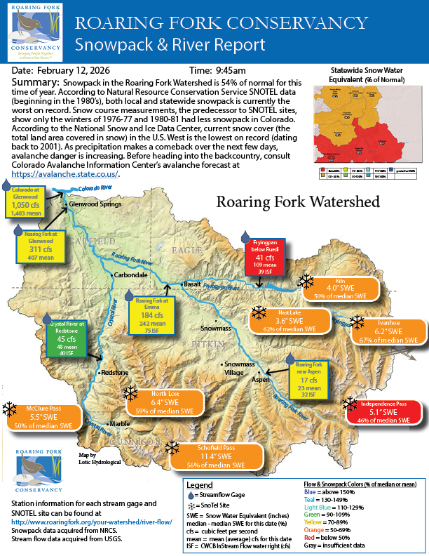 Snowpack in the Roaring Fork Watershed is 54% of normal for this time of year. According to Natural Resource Conservation Service SNOTEL data (beginning in the 1980’s), both local and statewide snowpack is currently the worst on record. Snow course measurements, the predecessor to SNOTEL sites, show only the winters of 1976-77 and 1980-81 had less snowpack in Colorado. According to the National Snow and Ice Data Center, current snow cover (the total land area covered in snow) in the U.S. West is the lowest on record (dating back to 2001). As precipitation makes a comeback over the next few days, avalanche danger is increasing. Before heading into the backcountry, consult Colorado Avalanche Information Center’s avalanche forecast at https://avalanche.state.co.us/.