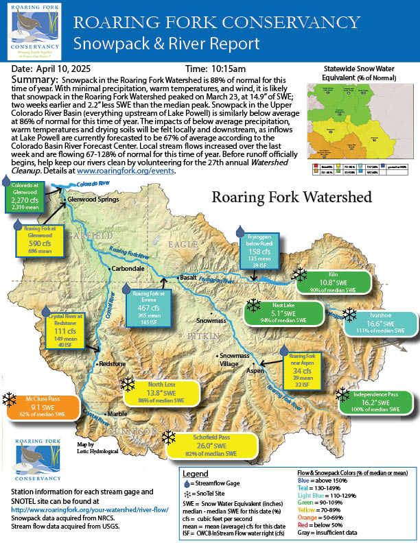 Snowpack in the Roaring Fork Watershed is 88% of normal for this time of year. With minimal precipitation, warm temperatures, and wind, it is likely that snowpack in the Roaring Fork Watershed peaked on March 23, at 14.9” of SWE; two weeks earlier and 2.2” less SWE than the median peak. Snowpack in the Upper Colorado River Basin (everything upstream of Lake Powell) is similarly below average at 86% of normal for this time of year. The impacts of below average precipitation, warm temperatures and drying soils will be felt locally and downstream, as inflows at Lake Powell are currently forecasted to be 67% of average according to the Colorado Basin River Forecast Center. Local stream flows increased over the last week and are flowing 67-128% of normal for this time of year. Before runoff officially begins, help keep our rivers clean by volunteering for the 27th annual Watershed Cleanup. Details at www.roaringfork.org/events.