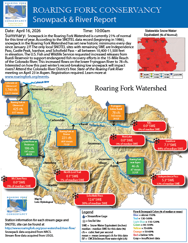 Snowpack in the Roaring Fork Watershed is currently 21% of normal for this time of year. According to the SNOTEL data record (beginning in 1986), snowpack in the Roaring Fork Watershed has set new historic minimums every day since January 27! The only local SNOTEL sites with remaining SWE are Independence Pass, Castle Peak, Ivanhoe, and Schofield Pass – all between 10,400-11,500 feet in elevation. The U.S. Fish and Wildlife Service requested increased releases from Ruedi Reservoir to support endangered fish recovery efforts in the 15-Mile Reach of the Colorado River. This increased flows on the lower Fryingpan River to 78 cfs. Interested on how this past winter’s record-breaking low snowpack will impact rivers? Attend the Colorado River District’s free State of the Roaring Fork River meeting on April 23 in Aspen. Registration required. Learn more at www.roaringfork.org/events.