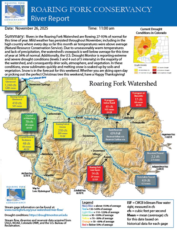 Rivers in the Roaring Fork Watershed are flowing 27-93% of normal for this time of year. Mild weather has persisted throughout November, including in the high country where every day so far this month air temperatures were above average (Natural Resource Conservation Service). Due to unseasonably warm temperatures and lack of precipitation, the watershed’s snowpack is well below average for this time of year at 34% of normal. Additionally, the U.S. Drought Monitor is reporting extreme and severe drought conditions (levels 3 and 4 out of 5 intensity) in the majority of the watershed, and consequently drier soils, atmosphere, and vegetation. In these conditions, snow sublimates quickly and melting snow is soaked up by soils and vegetation. Snow is in the forecast for this weekend. Whether you are skiing open day or picking out the perfect Christmas tree this weekend, have a Happy Thanksgiving!
