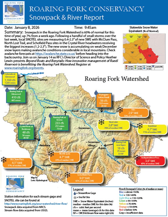 Snowpack in the Roaring Fork Watershed is 60% of normal for this time of year, up 7% from a week ago. Following a handful of small storms over the last week, local SNOTEL sites are measuring 0.4-2.3” of new SWE with McClure Pass, North Lost Trail, and Schofield Pass sites in the Crystal River headwaters receiving the biggest increases (1.2-2.3”). The new snow is accumulating on weak December snow layers making avalanche conditions considerable in local mountains. Check avalanche forecasts at https.//avalanche.state.co.us/ before heading into the backcountry. Join us on January 14 as RFC’s Director of Science and Policy Heather Lewin presents Beyond Boats and Bonytails: How innovative management of Ruedi Reservoir is benefitting the Roaring Fork Watershed. Register at www.roaringfork.org/events.