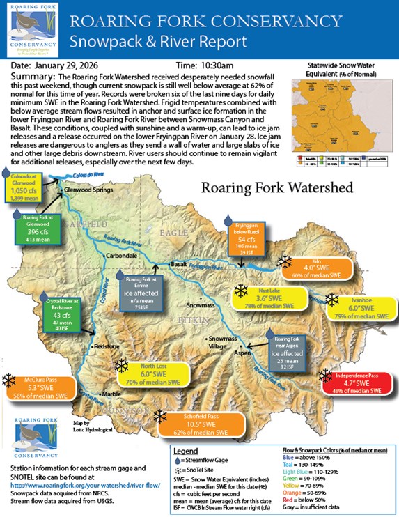 The Roaring Fork Watershed received desperately needed snowfall this past weekend, though current snowpack is still well below average at 62% of normal for this time of year. Records were broken six of the last nine days for daily minimum SWE in the Roaring Fork Watershed. Frigid temperatures combined with below average stream flows resulted in anchor and surface ice formation in the lower Fryingpan River and Roaring Fork River between Snowmass Canyon and Basalt. These conditions, coupled with sunshine and a warm-up, can lead to ice jam releases and a release occurred on the lower Fryingpan River on January 28. Ice jam releases are dangerous to anglers as they send a wall of water and large slabs of ice and other large debris downstream. River users should continue to remain vigilant for additional releases, especially over the next few days.