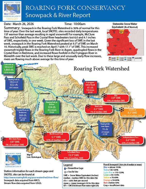 Snowpack in the Roaring Fork Watershed is 36% of normal for this time of year. Over the last week, local SNOTEL sites recorded daily temperatures 15F warmer than average resulting in rapid snowmelt! For example, McClure Pass and Schofield Pass in the Crystal River headwaters lost 6.0 and 4.1 inches of SWE, respectively, in one week. Given the significant loss of SWE in the last week, snowpack in the Roaring Fork Watershed peaked at 9.3” of SWE on March 10. Historically, peak SWE is reached on April 7 with 17.1” of SWE. This increased snowmelt tripled flows in the Roaring Fork River in Aspen, quadrupled flows in the Crystal River in Redstone, and increased flows fivefold in the Fryingpan River in Meredith over the last week. Due to these large and unusually early flow increases, rivers are flowing much above average for this time of year.