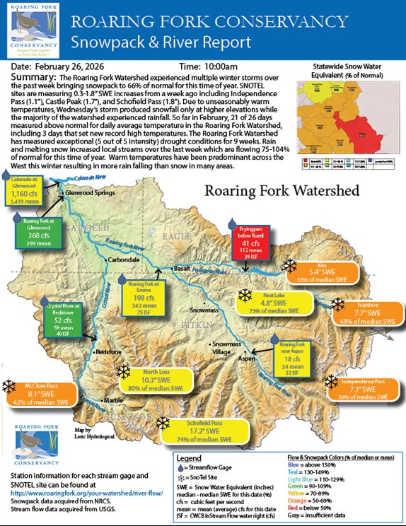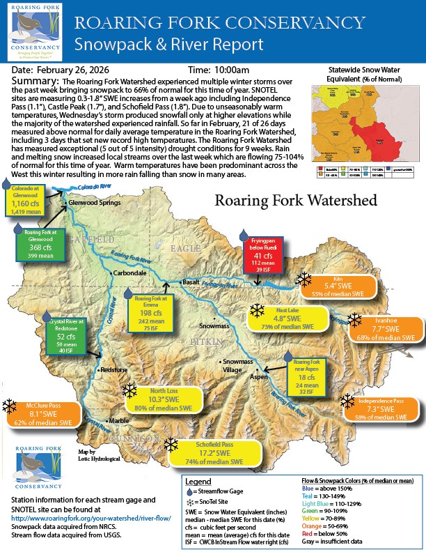 The Roaring Fork Watershed experienced multiple winter storms over the past week bringing snowpack to 66% of normal for this time of year. SNOTEL sites are measuring 0.3-1.8” SWE increases from a week ago including Independence Pass (1.1”), Castle Peak (1.7”), and Schofield Pass (1.8”). Due to unseasonably warm temperatures, Wednesday’s storm produced snowfall only at higher elevations while the majority of the watershed experienced rainfall. So far in February, 21 of 26 days measured above normal for daily average temperature in the Roaring Fork Watershed, including 3 days that set new record high temperatures. The Roaring Fork Watershed has measured exceptional (5 out of 5 intensity) drought conditions for 9 weeks. Rain and melting snow increased local streams over the last week which are flowing 75-104% of normal for this time of year. Warm temperatures have been predominant across the West this winter resulting in more rain falling than snow in many areas.