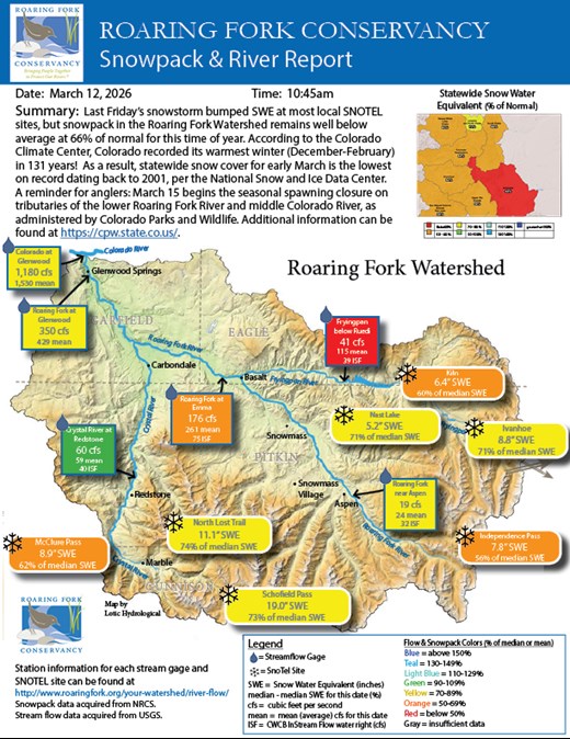 Last Friday’s snowstorm bumped SWE at most local SNOTEL sites, but snowpack in the Roaring Fork Watershed remains well below average at 66% of normal for this time of year. According to the Colorado Climate Center, Colorado recorded its warmest winter (December-February) in 131 years! As a result, statewide snow cover for early March is the lowest on record dating back to 2001, per the National Snow and Ice Data Center. A reminder for anglers: March 15 begins the seasonal spawning closure on tributaries of the lower Roaring Fork River and middle Colorado River, as administered by Colorado Parks and Wildlife. Additional information can be found at https://cpw.state.co.us/.