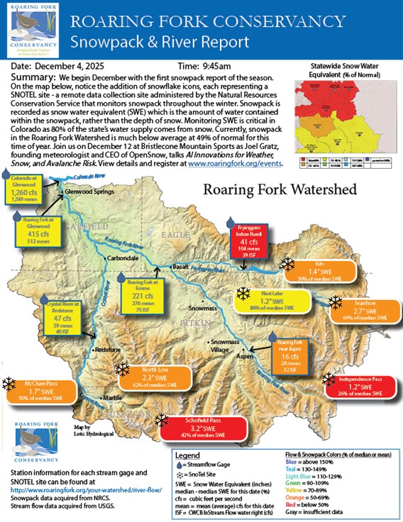 We begin December with the first snowpack report of the season. On the map below, notice the addition of snowflake icons, each representing a SNOTEL site - a remote data collection site administered by the Natural Resources Conservation Service that monitors snowpack throughout the winter. Snowpack is recorded as snow water equivalent (SWE) which is the amount of water contained within the snowpack, rather than the depth of snow. Monitoring SWE is critical in Colorado as 80% of the state’s water supply comes from snow. Currently, snowpack in the Roaring Fork Watershed is much below average at 49% of normal for this time of year. Join us on December 12 at Bristlecone Mountain Sports as Joel Gratz, founding meteorologist and CEO of OpenSnow, talks AI Innovations for Weather, Snow, and Avalanche Risk. View details and register at www.roaringfork.org/events.